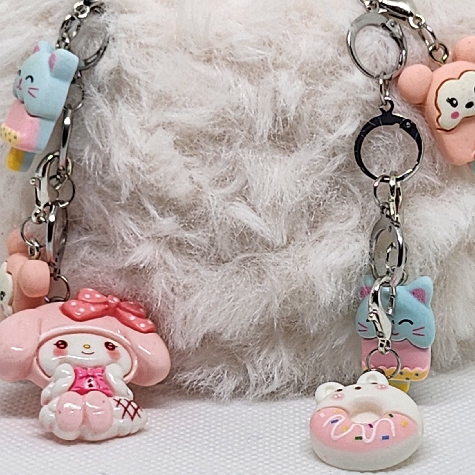 il y a 5 marqueurs de mailles différents dont 2 mignons beignets et 2 glace rose et bleu avec My Melody en décoratif.